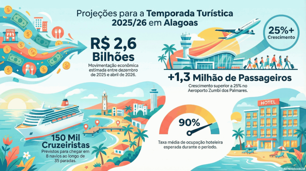 O Aeroporto Internacional Zumbi dos Palmares deve receber mais de 1,3 milhão de passageiros, o que representa um crescimento superior a 25% em relação à temporada anterior. Pelo mar, 150 mil cruzeiristas, distribuídos em oito navios, aportarão em Maceió ao longo de 35 paradas durante os seis meses de operação.